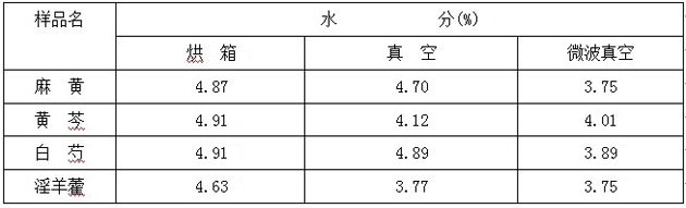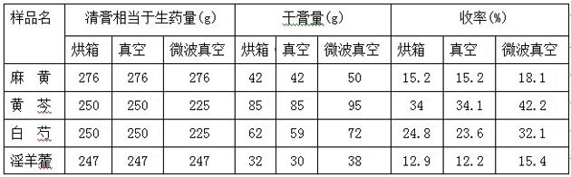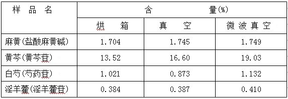 干燥技術(shù)是中成藥生產(chǎn)過(guò)程中的重要工藝過(guò)程之一,隨著對(duì)干燥特性認(rèn)識(shí)的進(jìn)一步深化,不同干燥方法以及不同干燥溫度對(duì)藥品質(zhì)量影響受到廣泛關(guān)注。為了驗(yàn)證烘箱干燥,真空干燥和微波真空干燥不同的特性及各干燥方法對(duì)中藥提取物干燥行為的結(jié)果,本實(shí)驗(yàn)對(duì)4種中藥浸膏的干燥方法進(jìn)行了對(duì)比實(shí)驗(yàn),研究了不同干燥方法對(duì)中藥中有效成份含量的影響,以期為選擇中藥浸膏干燥方法提供科學(xué)依據(jù)。